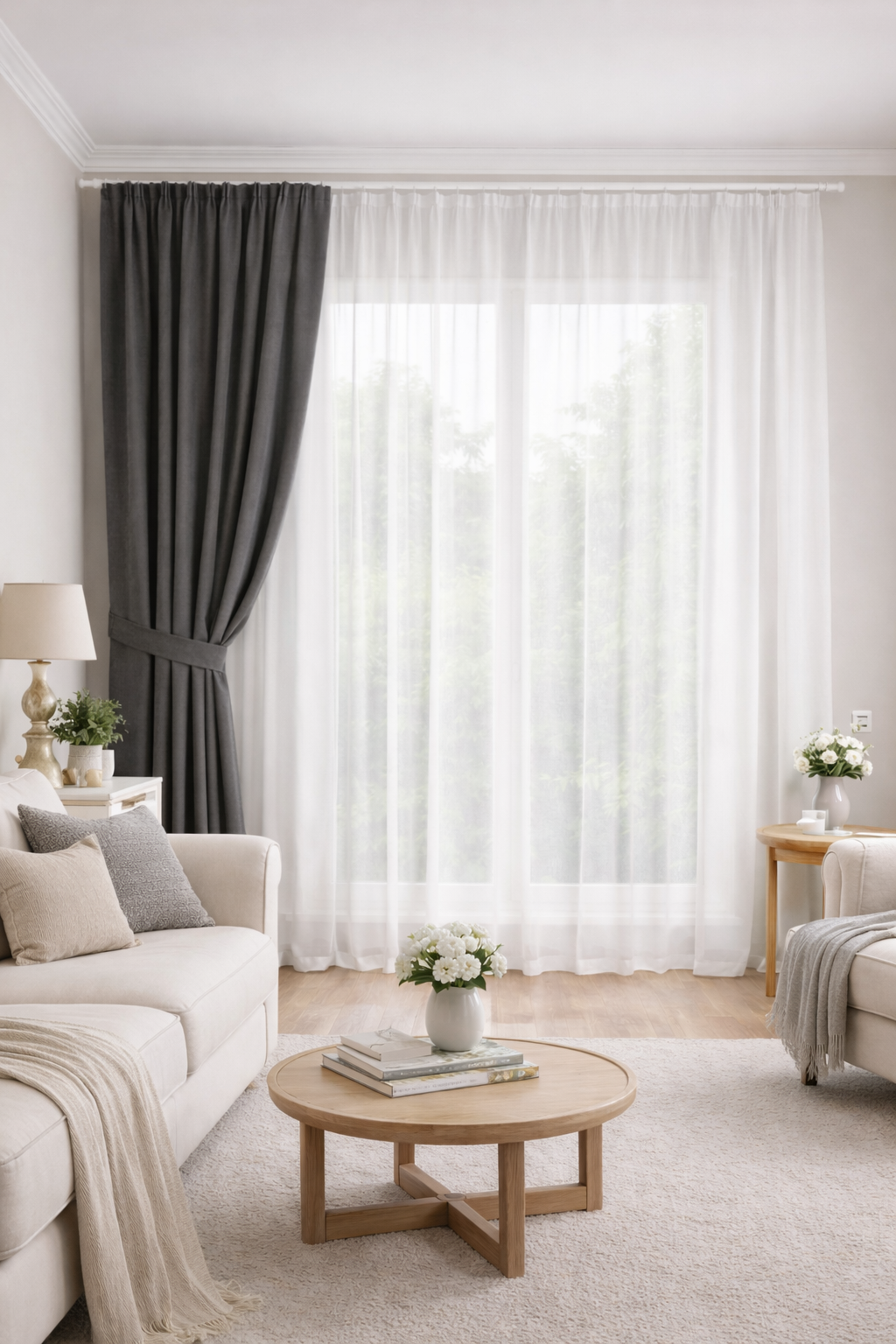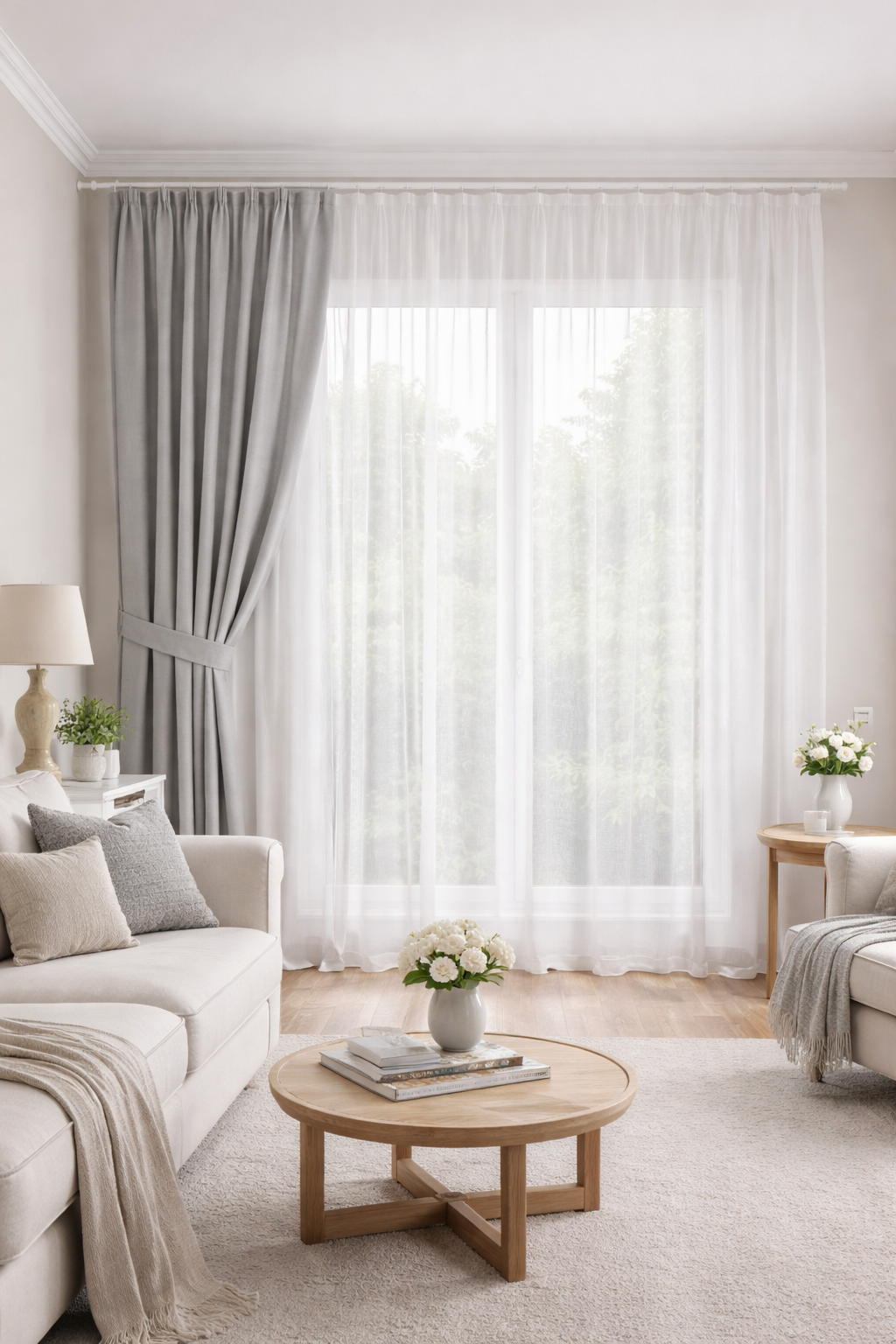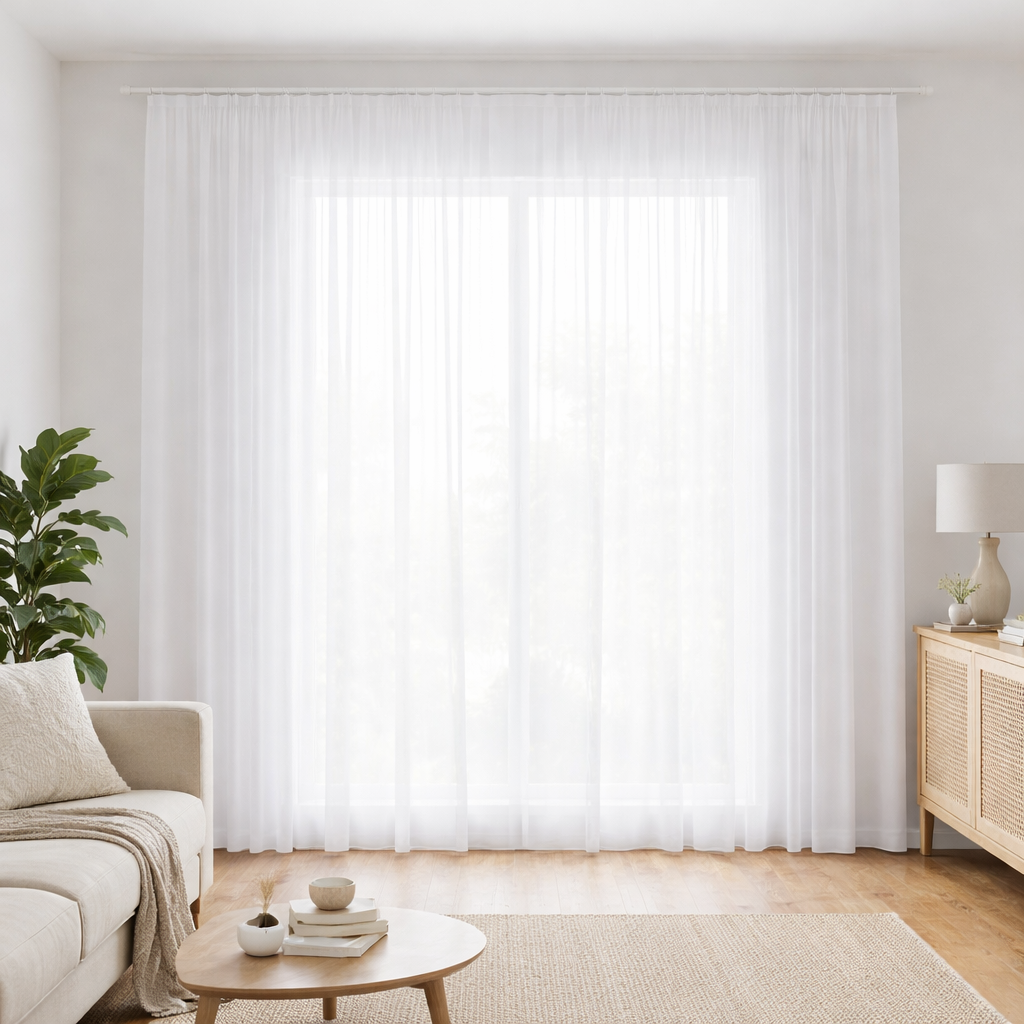 Perdea din voal alb, simplă și elegantă, cu cădere dreaptă.